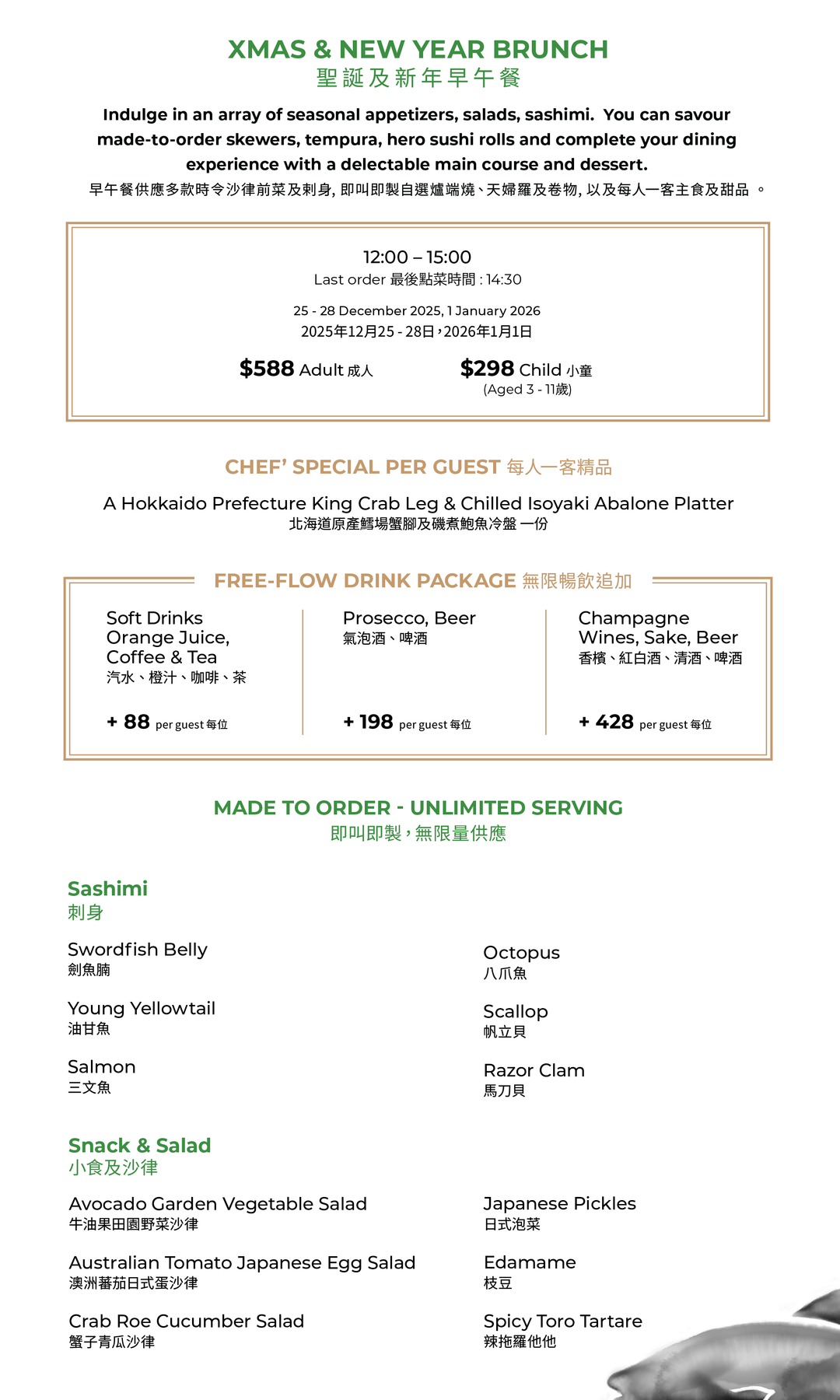 Christmas & New Year Brunch 25th - 28th Dec 2025 & 1st Jan 2026 12:00pm-3:00pm HK$ 588 per adult | HK$ 298 per Child (3-11 Years Old)