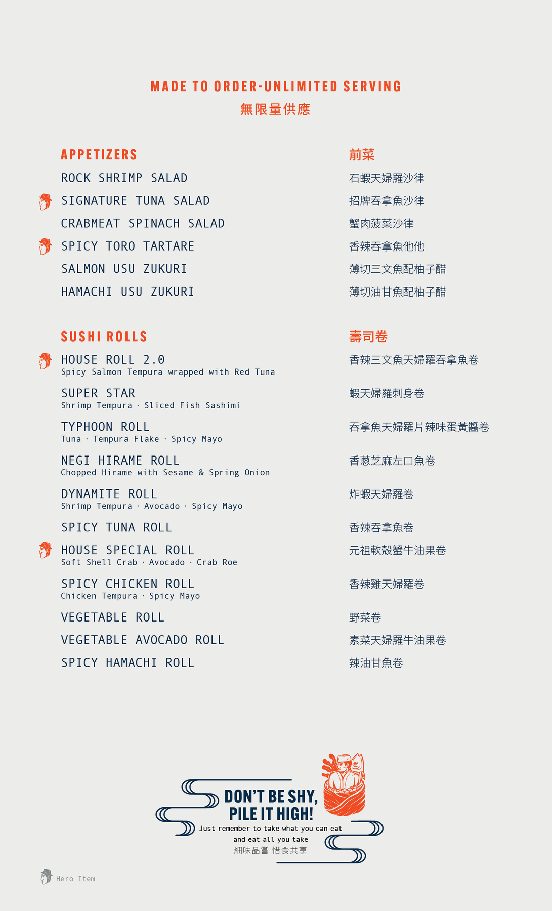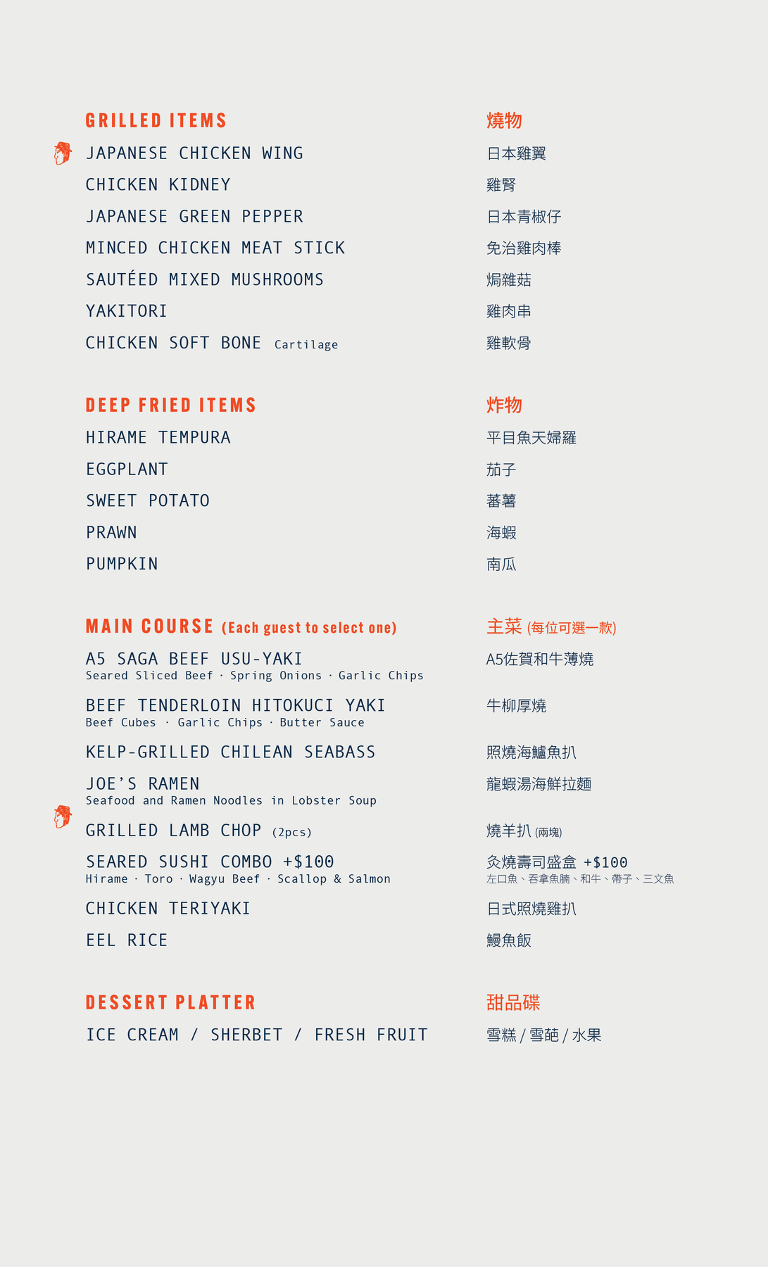 *Unless stated otherwise, any discounts offered are for food only. Drinks and beverages are not include. *Deposit payment of HK$200 per guest is required to secure your seat, which will be deducted off the final bill. If an infant aged 3 or under needs to occupy a seat, please include them in the booking number and settle a deposit. Please note that we arrange seats based on the number of guests specified in the reservation.