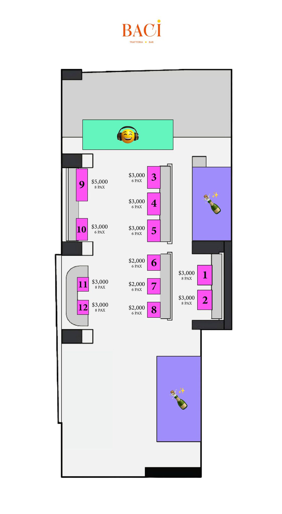| Tables (1, 2, 11, 12) | Up to 8 | $3,000 |