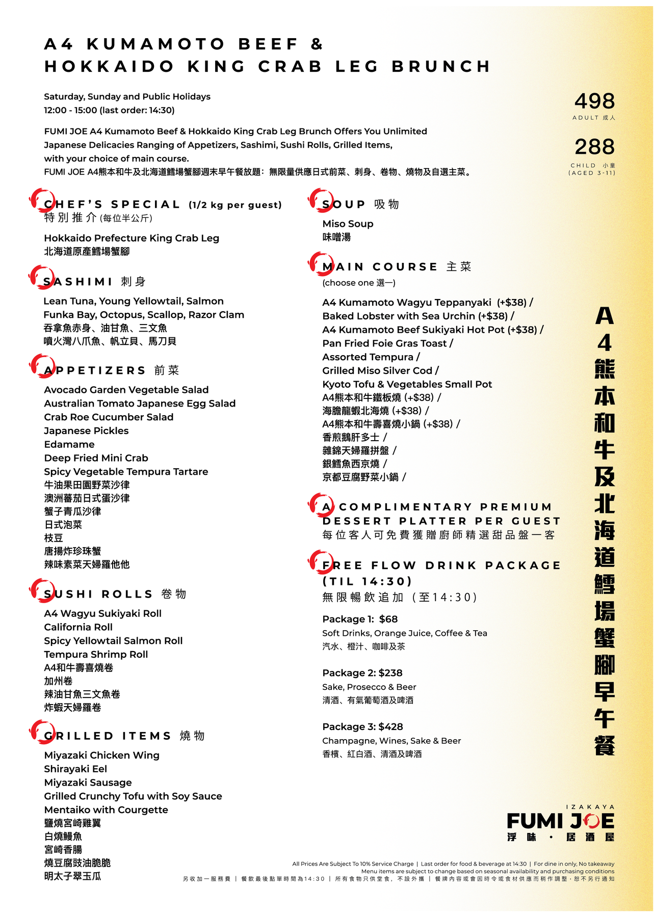This Father's Day, celebrate with FUMI JOE's A4 Kumamoto Beef & Hokkaido King Crab Leg all-you-can-eat brunch which offers you unlimited Japanese delicacies ranging from appetisers, sashimi, sushi rolls, tempura, grilled items with your choice of main course.